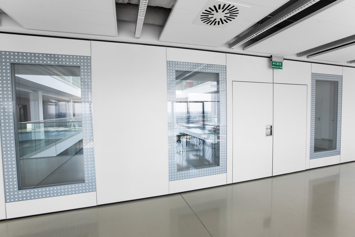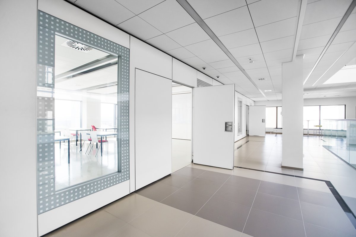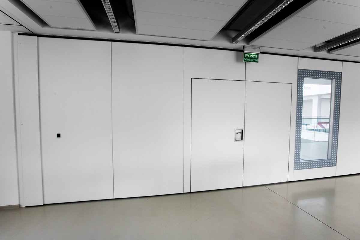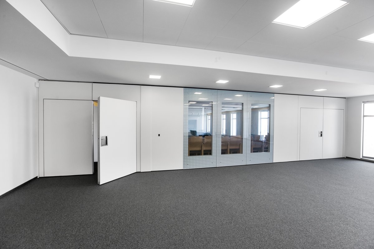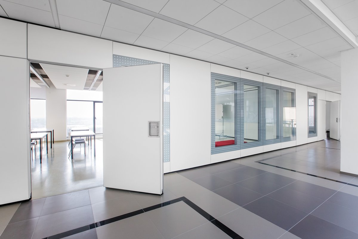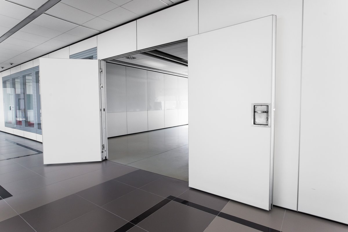 Parete mobile manovrabile per dividere uno spazio aperto in sale più piccole.