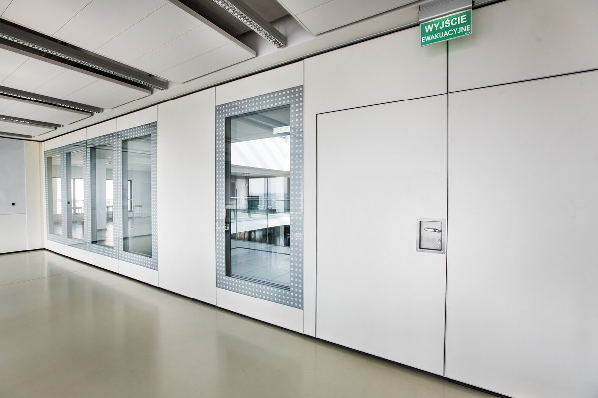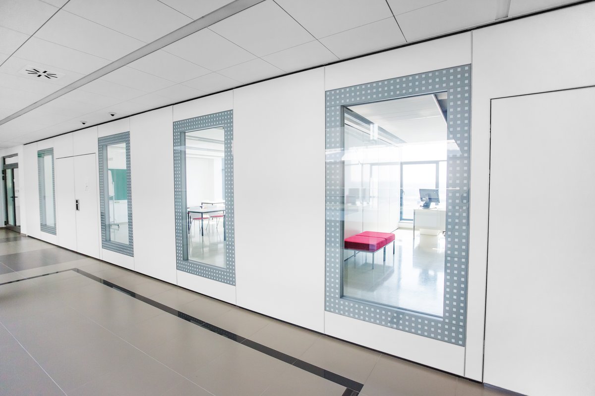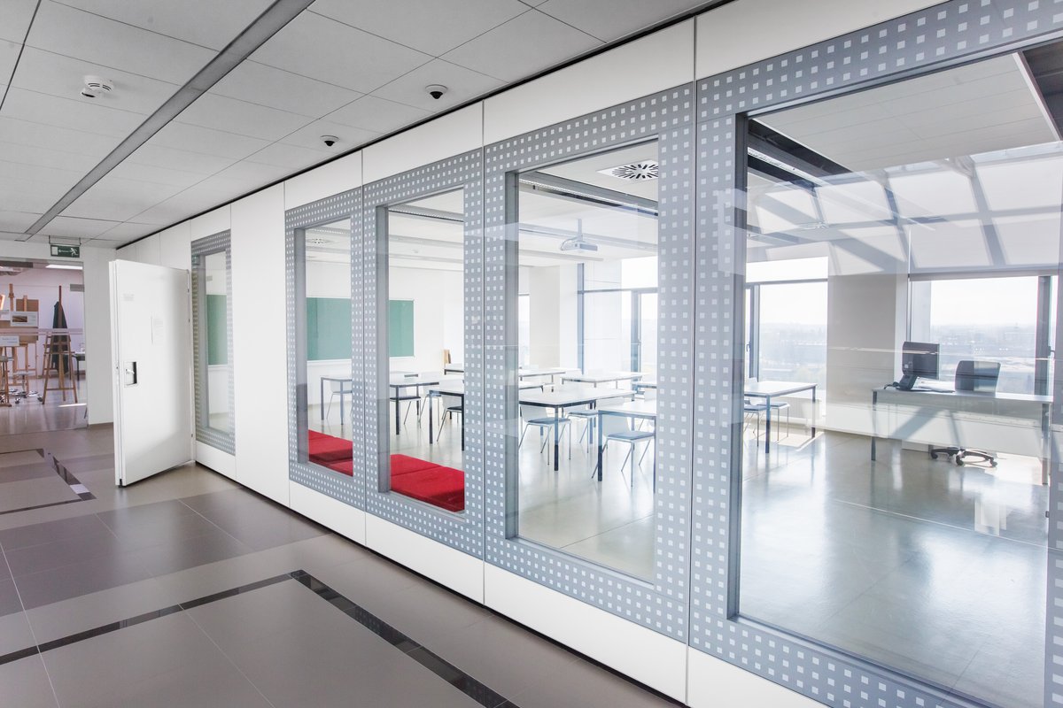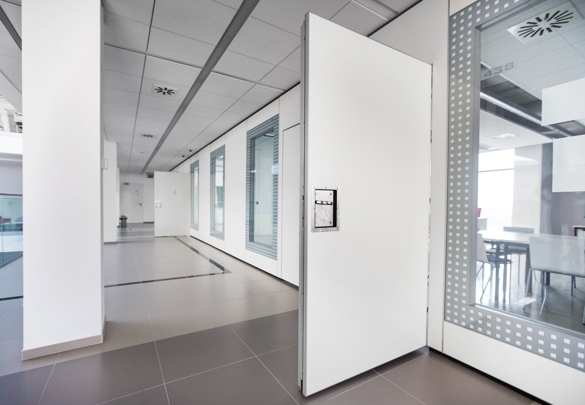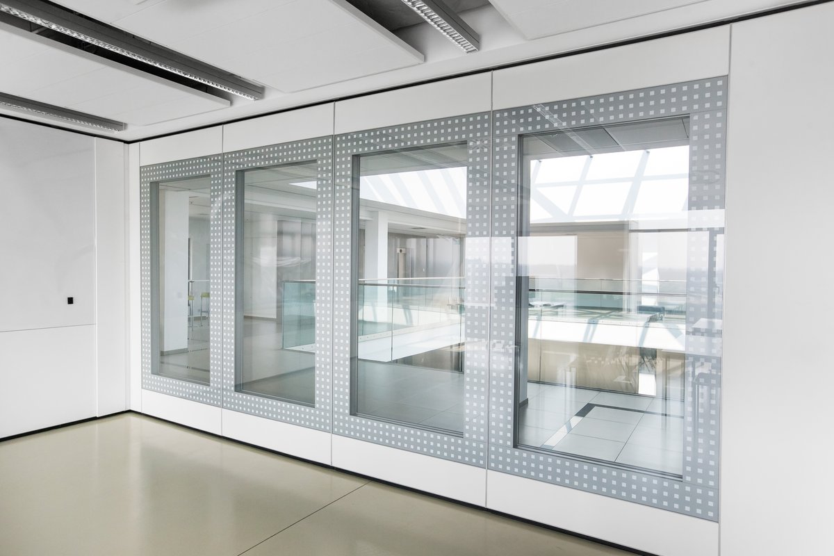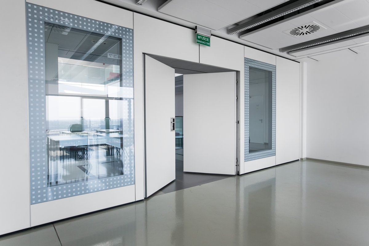 Parete mobile manovrabile per dividere uno spazio aperto in sale più piccole.